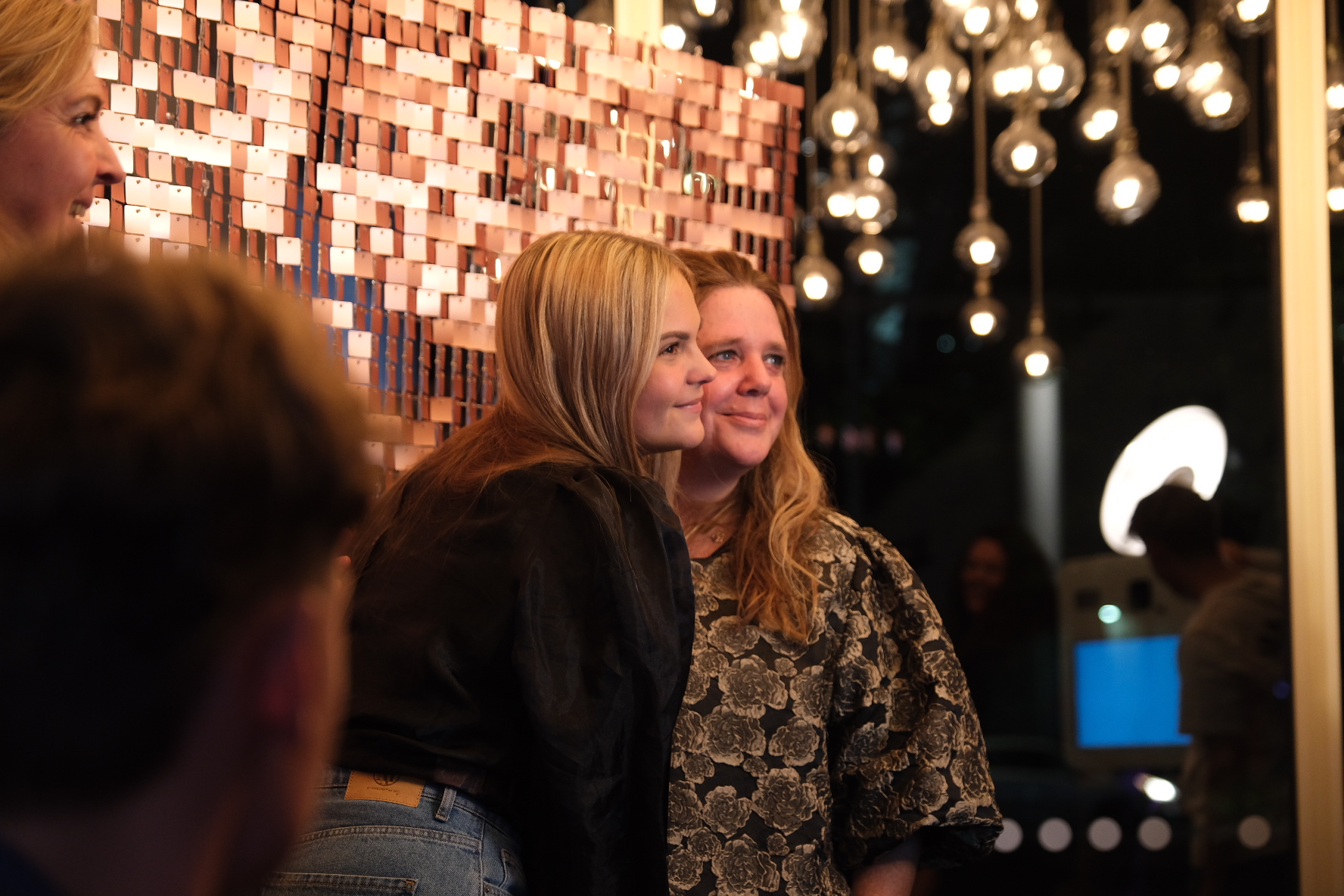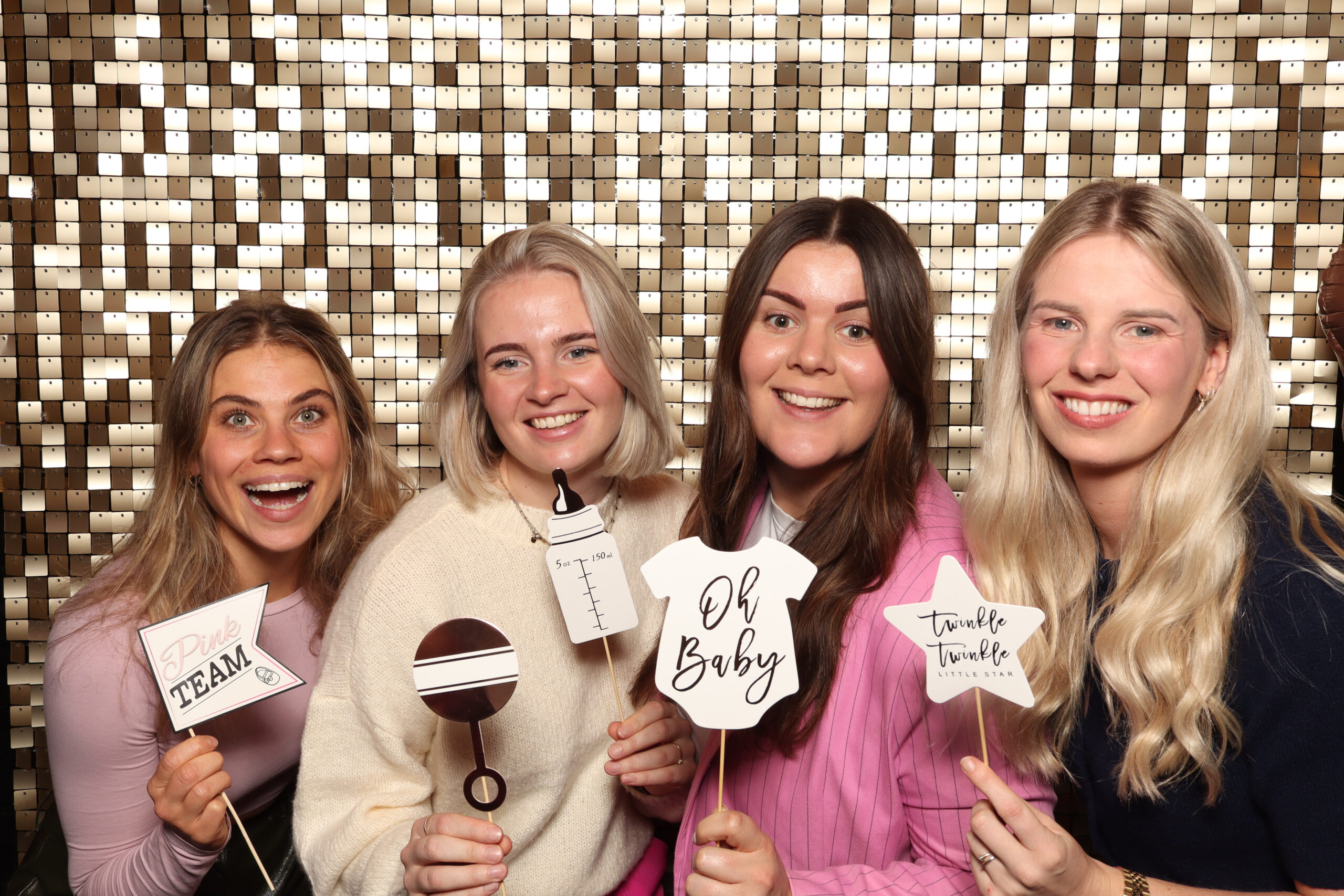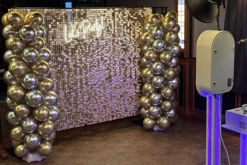 Dan kun je kiezen voor een luxe shimmerwall achtergrond. Deze is beschikbaar in champagnegoud, zilver of mat roze en zorgt ervoor dat de foto’s nog beter tot hun recht komen — op de fotostrip én later in het digitale album.